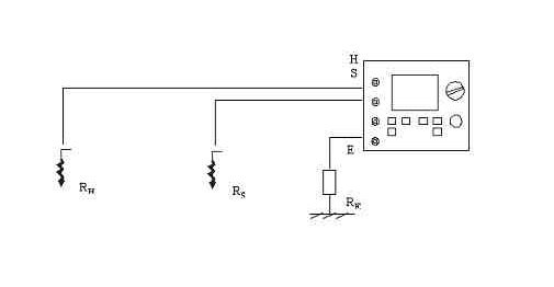 Для виміру опору R E Штир заземлення зазвичай використовується метод 3-х електродів. Також можна виміряти і опір допоміжних штирів заземлення – R S та R H . Користувач може вибирати частоту вимірювального сигналу в межах від 41 до 5 кгц або прилад зробить це автоматично.