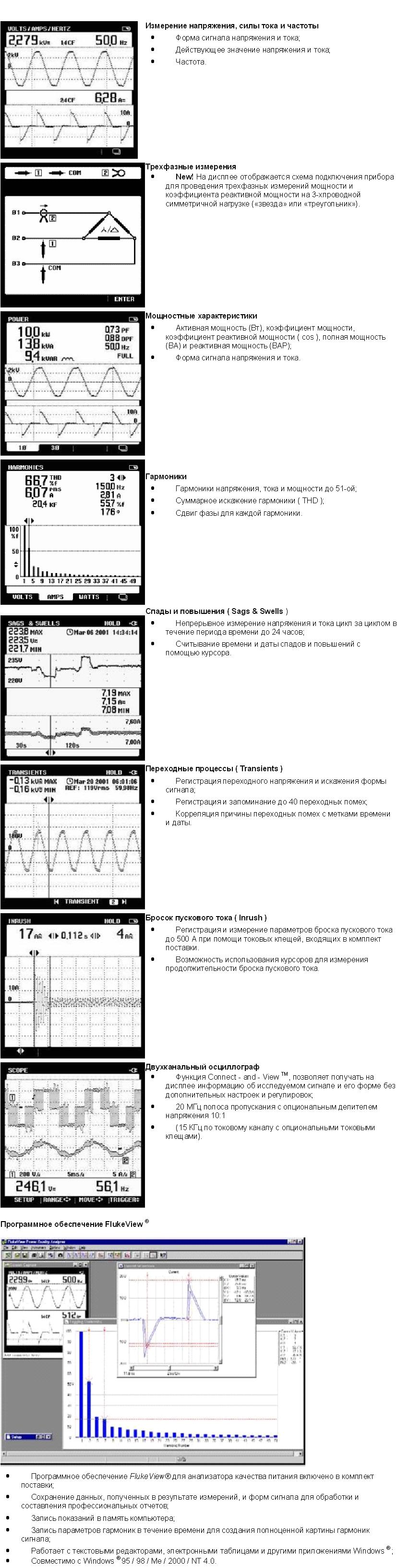 - Програмне забезпечення FlukeView ® дозволяє записувати параметри гармонік та будь-які інші показання приладу протягом періоду часу;
