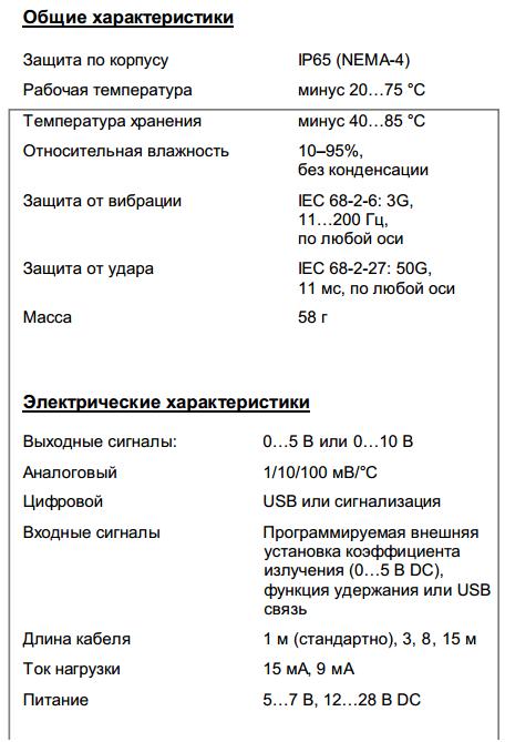 Особливості: - Габаритні розміри: різьблення M12x1 довжина 87 мм, корпус із нержавіючої сталі - Діапазон виміру: мінус 40…1030 °C - Робота за температури навколишнього середовища до 75 °C без охолодження - Вбудована електроніка, СІД - Вихідний сигнал, що масштабується: 0…10 В або 0…5 В - Захист від коротких замикань - Налаштування обробки сигналу - Цифровий інтерфейс USB та програмне забезпечення (опція) - Харчування: 5 7 12 28 В DC