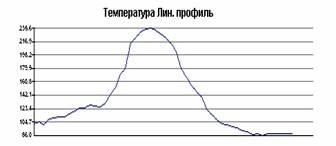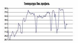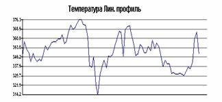 На рис.2 наведена термограма та лінійний профіль температур фрагмента зовнішньої поверхні склепіння мартенівської печі. Як видно, зміни температур у межах області контролю досягають 200 °С, останнє свідчить про значні локальні області підвищеного зносу футерування зводу печі.