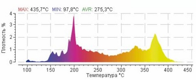 На рис 3. наведено вигляд функції перетвореної термограми фрагмента склепіння мартенівської печі. Так, як критерій граничного стану зносу футерування може бути обрано значення максимуму даної функції в заданому температурному інтервалі, наприклад, 350-450°С чи чисельне значення інтеграла даної функції.