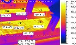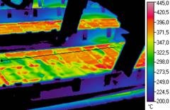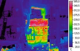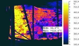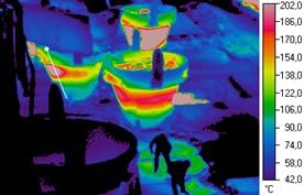 На рис.1. - рис.2 наведено деякі ілюстрації застосування тепловізійної системи Flir T640 у металургійному виробництві. На рис.1 наведена термограма фрагмента бічної поверхні мартенівської печі з областю кладки, що має підвищений рівень зношування. Безперервний контроль температурного поля кладки дає можливість оператору плавильної печі провести низку операцій з керування режимом горіння пальника та завантаженням металу, підтримуючи температурний режим кладки в межах допустимих значень та успішно завершити процес плавильної кампанії до проведення ремонту.